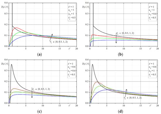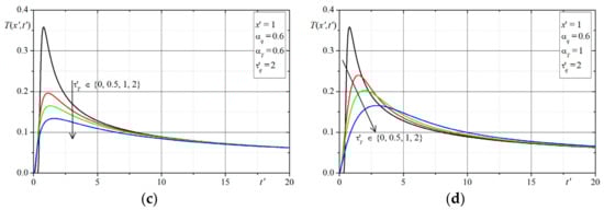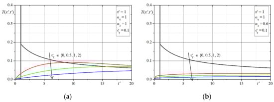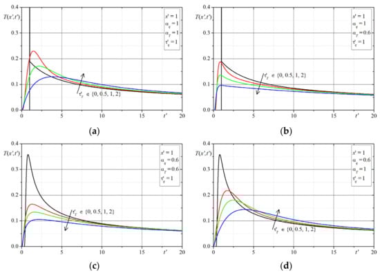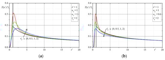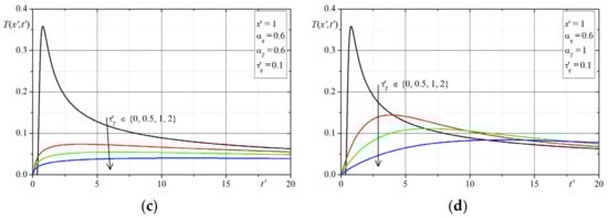 Remarks on Solutions: In the presented examples, the cases of solutions for have been omitted (the considered Equation (16) for becomes the parabolic type equation and its solution takes on another special form). Assuming then the parameter B = 0 and hence the solutions in dimensionless variables do not depend on the values of parameter . It can be seen in the above plots, that in the solutions for and (this case corresponds to the classical Cattaneo equation), the characteristics peaks (the Dirac delta) are at the front of the thermal wave (considering the assumed initial conditions here). Analyzing all of the solutions presented in the plots (i.e., the changes of temperature in time at selected points of domain were determined depending on 4 parameters: ), one can conclude that the largest differences in the course of solutions (temperatures) occur in the initial period of time , while if then the differences resulting from the influence of the parameters disappear. In order to verify the correctness of the solutions for the given initial conditions, we additionally determined numerically the value of integral which should be equal to for and this property was satisfied in all cases for the parameters.