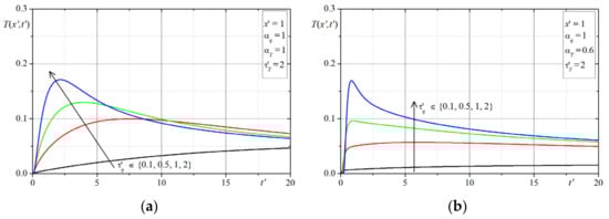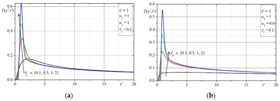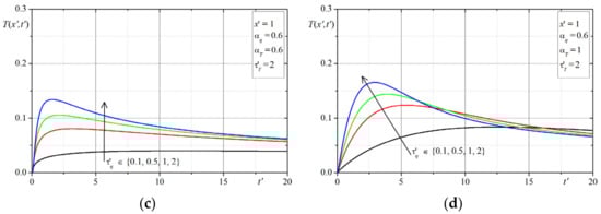 The solution presented in the Section 3, was be used to investigate the effect of the time-fractional order of the Caputo derivatives ( and ) as well as the phase-lag parameters ( and ) on the temperature distribution in the 1D domain. Two examples are presented. Note that the numerical calculations in all examples were performed for the non-dimensional variables given by Equations (20)–(23).