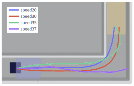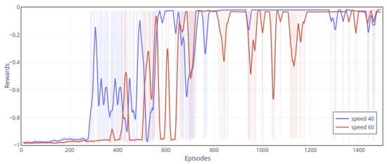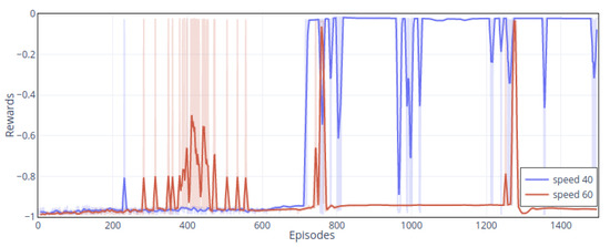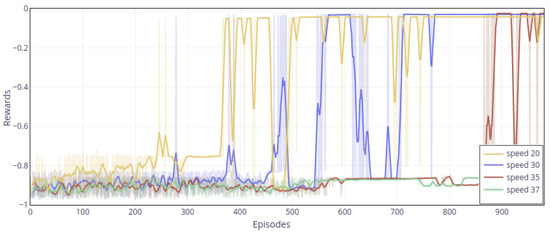 To show the overall trends of cumulative rewards, we smoothed the results. The darker lines are the result of smoothing. The light-colored line is the original result. The frequency of reaching the target with the MDAC method is significantly higher than that of double DDPGs. Both policies reach the target area in the initial stage but used more steps, and the total rewards are about −0.3 (episode 400 and 500). Then, policies gradually increase rewards to about −0.2, indicating that their policies are intended to improve the overall speed to acquire higher rewards. Starting from the 600th episode, the MDAC’s agent can reach the target area more stably, and the rewards gradually increase. For the double DDPGs, although it reaches the target in some episodes (episode 400, 1200, etc.), it is precarious. In most episodes, it is difficult to get to the end and collide with obstacles. For each trained policy, we plot the speed curves and trajectories.