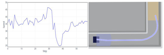 Finally, Figure 16 compares the speed adjustment strategies of the MDAC and double DDPGs. Both methods drive the robot at a lower speed due to the challenging environment. However, the speed of double DDPG behaves with uncertainty, causing the agent to be unable to optimize to a stable policy. The MDAC’s speed behaves stably, starting with 40 units of speed and dropping to between 20 and 25 at the first turn. After that, it maintains a constant speed at around 26. In the subsequent turns, due to the narrow roads, the speed gradually decreased and finally stabilized at 20. Compared to double DDPGs, a significant difference is that the speed adjustment is relatively stable. The high-level module controls whether to enable the speed adjusting sub-module based on state. Thus, it behaves stably and can reach the destination stably in the later period.