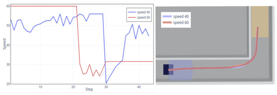 Since the speed 60 trial does not converge and behaves badly, here we only plot the overall speed curve at the default speed 40 as the left side in Figure 6. It can be seen that the trained policy plans to reduce speeds near the environment’s corner (at step 31) to avoid an obstacle. However, each step’s velocity is changing, which introduces an unstable robot’s state and makes it easy to crash. It also does difficult policy training. Similarly, we plot the typical route as the right side in Figure 6 with the default speed of 40. The path can reach the target area safely.
