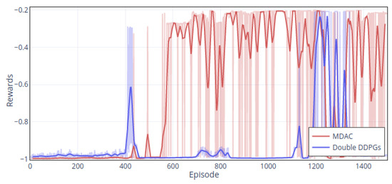 In the experiment, we use double DDPGs and MDAC methods for training. The neural network and the number of neurons used are also the same. Hyperparameters are as Table 1. The training results are shown in Figure 10.