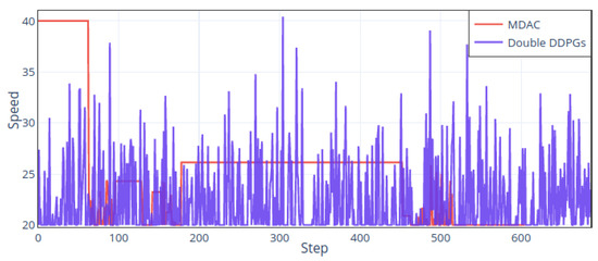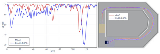 Figure 11 shows the speed and routes’ records in default 50 speed. From the speed figure (Left), two speeds’ control policies are similar, and the speeds appropriately reduce when turning, especially at the last turn (Step 110). The upper left’s final turn is the narrowest, so both policies reduce the speed as much as possible. The difference between the two is also apparent. The MDAC’s policy can maintain a speed when its adjustment is not required, making the whole training process and states more stable. The double DDPGs’ speed keeps changing, which is not conducive to training stability. The instability can also be seen in the rewards’ result figures. The right part of Figure 11 is the trajectories of two methods, not much difference.