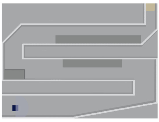 In this environment (Figure 9), we test the training stability, path, and speed planning ability in a long-path maze. The width of the road gradually changes, and the yellow part is the targeted area. The starting point of the path is in the lower-left position. The turning angles are more diverse. The path becomes narrow from the upper right corner, which makes the robot’s turning difficult. On the upper left corner, the turning angle is a right-angle. Finally, reach the targeted area to complete a mission round. The environment contains more scenarios and conditions, so it has higher requirements for policy training.
