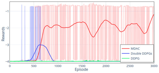 The experiment has 3000 episodes in total, and each episode has 800 steps at the maximum. Figure 13 shows the episodes’ cumulative rewards in the training period. The DDPG has not reached the target area throughout the process, and the rewards are around −4. We smoothed the original data for double DDPGs and MDAC to facilitate comparison, and darker lines are the smoothed data. The double DDPGs method only reaches the target area a few times around the 500th episode and has never reached the target area after the 600th episode. The MDAC reaches the target stably, starting from the 500th episode to the end of the training.