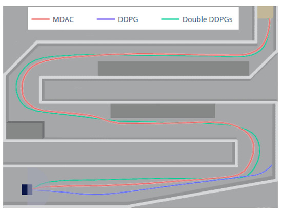 Next, Figure 14 shows the typical routes of three methods. The DDPG cannot complete the first turn and thus finds a path to maximize the steps to obtain more rewards. The double DDPGs method has reached the target area in some episodes, and we pick one route in this period. The route is relatively close to the one by MDAC, which is more stable during training. Both paths can accurately avoid obstacles and complete turns.