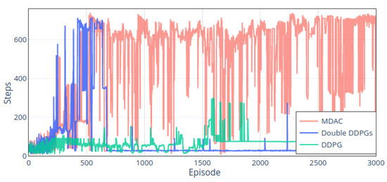 Figure 15 shows the steps used under each method in the whole process. Firstly, the DDPG is also trying to increase the number of steps to obtain more step rewards. However, overall, it is less than 200 steps except for some episodes between the 1500th and 2000th. The double DDPGs method reached the endpoint in the initial stage and took about 700 steps. Still, the performance of this method is unstable, resulting in inferior performance afterward, with each episode less than 100 steps. After the 500th episode, the MDAC method can stabilize the steps between 600 and 700 and behave more stable than double DDPGs. Even though it sometimes does not reach the target area, it collides more on the road around 400 steps. By comparison, the training of double DDPGs leads to the instability of the network, and the initially trained parameters cause worse performance in the subsequent training process. The MDAC can complete the task stably.