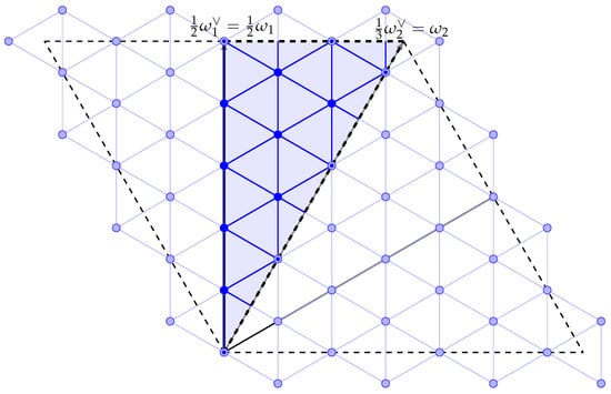 The dot of . The light blue triangle represents the fundamental domain . The boundary black dashed lines represent the Dirichlet walls . The point set , representing possible positions of the quantum particle, is formed by the dark dots. The lines connecting the dots symbolise the nearest neighbour coupling characterised by the hopping operator .