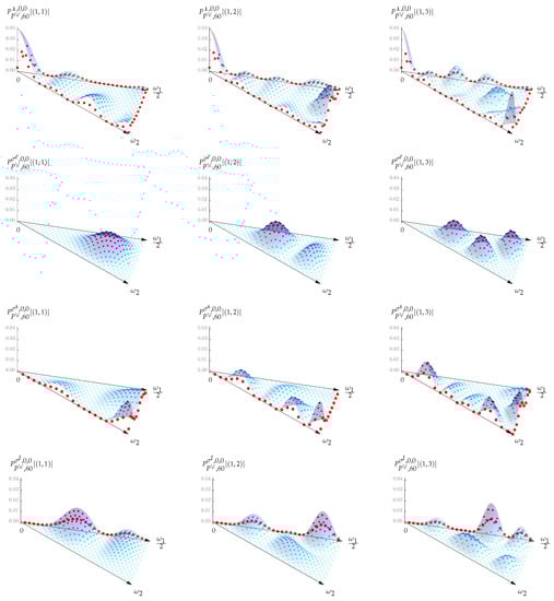 - The presence of the affine Weyl group orbits of the target positions in the coupling sets (51) represent the first essential symmetry component for implementing the interactions enforced by the boundaries of . Secondly, the addition of the sign -function (13) values over the affine-reflected positions in the coupling set counts the number and type of amplitude reflections between the source position and the target position . The -function generalises the sign functions from [40] that are necessary for describing the Galois symmetries of Weyl orbit functions. The square roots of the stabiliser ε-functions (7) present as factors in defining relation of the dual-weight hopping operators matrix elements in the position basis (52) and manifest a direct consequence of the weighted discrete orthogonality relations (39). The ε-function subsequently straightforwardly regulates the probabilities (74) of finding the particle in a stationary state on the Neumann walls of the simplex . The Neumann boundary effect, which is observed similarly in dual-root models [1], is pointedly evident in Figure 3 and Figure 6.
