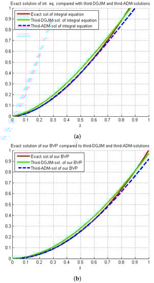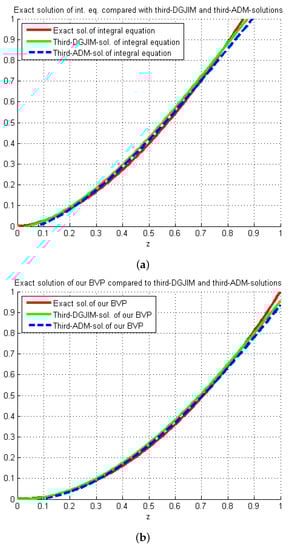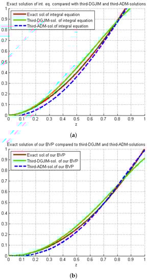 In consequence, the graphs of the three-term approximate solutions obtained by the DGJIM and ADM algorithm for the suggested RLFBVP (34) and the integral Equation (35) are plotted in Figure 2.