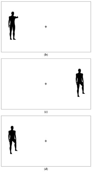 Examples of stimuli with an arm outstretched (a,b) and with a leg outstretched (c,d) on the right (a,c) and on the left (b,d) of the fixation cross.