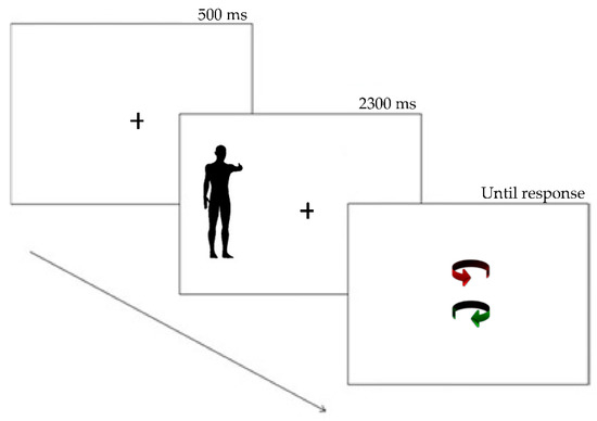 The experiment was performed with SuperLab 4.0 (Cedrus Corporation, San Pedro, CA, USA) on a Windows (Microsoft Corporation, Redmond, WA, USA) notebook equipped with an Intel (Intel Corporation, Santa Clara, CA, USA) processor and a 15.4-inch monitor. Participants were tested in a quiet room, seated at a 57 cm viewing distance from the computer screen, and they were invited to put their hands palms down on the table and not to cross any body part (i.e., legs, arms, or fingers) throughout the experiment. The experiment consisted of 256 trials (128 right trials and 128 left trials) in each of which a black fixation cross presented in the center of a blank screen was followed after 500 ms by one of the stimuli described previously presented laterally (12.4° from the fixation point) for 2300 ms and then by a couple of colored arrows—one located slightly above and the other located slightly below the center of the screen—depicting the two possible spinning directions of the silhouette (Figure 2). Participants were asked to gaze at the fixation point and to report the perceived spinning direction of the silhouette by pronouncing the words “ROSSO” (the Italian word for “RED”) and “VERDE” (“GREEN”) according to their percept. After the participant’s response was recorded by the experimenter, who was seated behind the participant and pressed the key “R” or “V” on a keyboard connected to the notebook, the next trial started.
