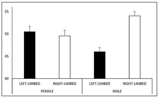 Male participants perceived a larger number of right- (M = 54.01%) rather than left-limbed figures (M = 45.99%; t39 = 4.152; p < 0.001), whereas no difference was observed in female participants (right-limbed: M = 49.53%; left-limbed: M = 50.47%; t48 = −0.368; p = 1). Moreover, the number of figures interpreted as right-limbed was larger for male than for female participants (t87 = 2.695; p = 0.008; Figure 4).