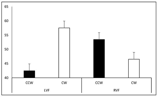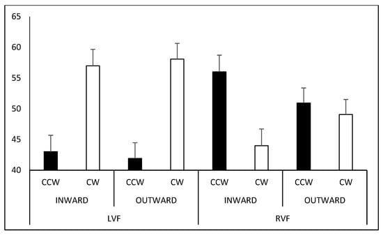 Participants perceived a larger number of CW- (M = 57.53%) rather than CCW-spinning figures (M = 42.47%; t88 = 3.108, p = 0.005) in the LVF, whereas no difference was observed in the RVF (CW-spinning: M = 46.53%; CCW-spinning: M = 53.47%; t88 = −1.443, p = 0.305). Moreover, a larger number of figures were interpreted as spinning CW in the LVF than in the RVF (t88 = 3.204, p = 0.002; Figure 6).