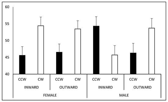 Male participants perceived a larger number of CW-spinning figures in the outward-rotation condition (M = 53.71%) than in the inward-rotation condition (M = 45.70%; t39 = 4.152, p < 0.001), whereas no significant difference was observed in female participants (outward-rotation condition: M = 53.46%; inward-rotation condition: M = 54.40%; t48 = −0.368, p = 1). Moreover, in the inward-rotation condition, female participants showed a statistical trend to perceive a larger number of CW-spinning figures (M = 54.40%) compared with male participants (M = 45.70%; t87 = 2.273, p = 0.051; Figure 7).