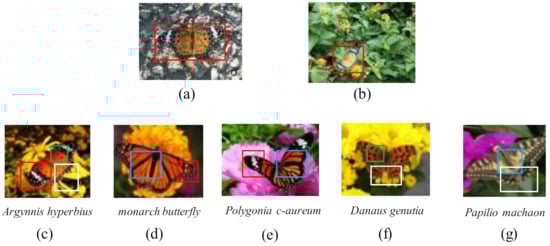 Differences comparison. (a,b) Butterfly images with complex background; (c–g) Butterfly species with similar features.