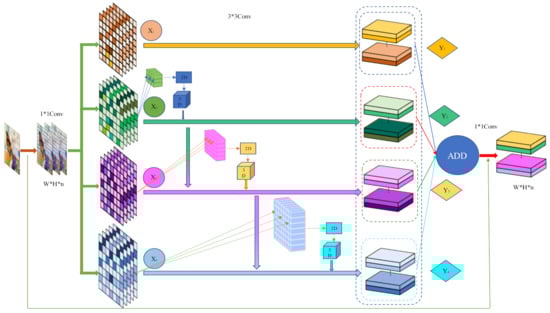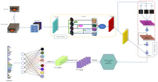 In this paper, the structure enabled the neural network to learn more detailed features of butterflies, such as spots of similar color and size and their spatial distribution, and greatly improved the accuracy of the recognition of subtle features among butterflies. Figure 6 is a schematic diagram of the detailed design of the MGFS structure.
