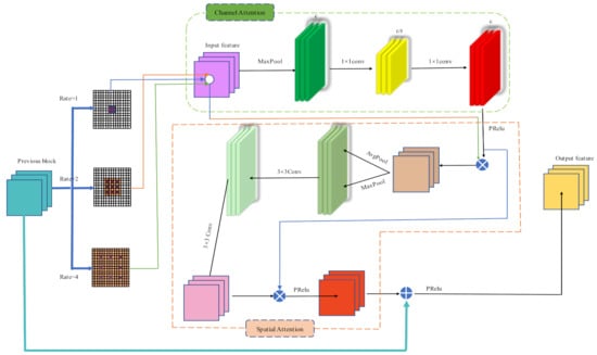 The lower part of Figure 3 shows the spatial attention module designed in this paper. The feature maps output by the channel attention module was used as the input of the spatial attention module, and the input feature map was the channel compressed using average pooling and max pooling, and then concat operation was performed and two 3 × 3 convolutions were used to extract receptive fields. Finally, the spatial attention feature maps were generated through the PRelu activation function.