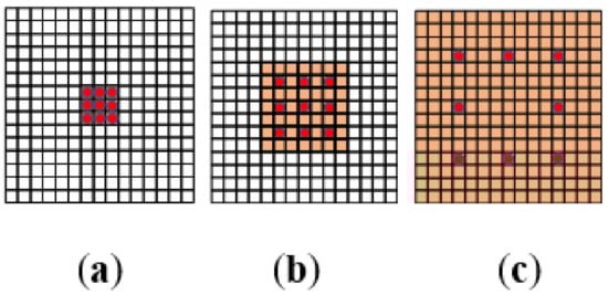 As shown in Figure 4, in the case of the same core size, different coefficients can lead to different receptive fields. In Figure 4a, the coefficient was 1, which was no different from traditional convolution. In Figure 4b, the coefficient was 2, and the receptive fields were expanded to 7 × 7. In Figure 4c, the coefficient was 4, and the receptive fields were expanded to 15 × 15.