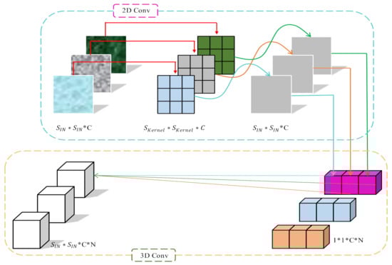 Suppose that the size of the input feature map is SIN ∗ SIN the number of channels is C, the size of the convolution kernel is SKernel ∗ SKernel and there are a total of N, the calculation amounts of traditional convolution and depthwise separable convolution are shown in Equations (4) and (5):