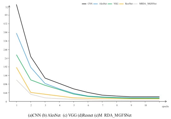 We used the MRDA-MGFSNet (Basic + MGFS + MRDA) network for butterfly fine-grained classification, and then tested and recognized the butterfly categories. In this paper, under the same experimental environment, we used CNN [], AlexNet-fc6 [], VGG16 [], DenseNet-161 [], Resnet-50 [] and other models to train our butterfly dataset. In addition, we called the network with an ordinary convolutional layer and residual structure except for MGFS and MRDA in this paper, as the Basic network and multi-scale network have the same multi-scale structure as MGFS and MRDA on the basis of the Basic network. The training loss of CNN is shown in the black solid line in Figure 8, and the training loss of ResNet-50 is shown in the blue solid line in Figure 8. The training loss of the AlexNet-fc6 is shown by the solid green line in Figure 8, the loss of VGG-16 is shown by the solid yellow line in Figure 8, and the method used in this paper is shown by the solid gray line in Figure 8. In this Figure, the horizontal axis represents the number of training epochs, and the vertical axis represents the loss. It can be seen that, compared with the CNN, AlexNet, VGG, and ResNet models, the MRDA-MGFSNet-based model had a lower loss value and a better training effect.