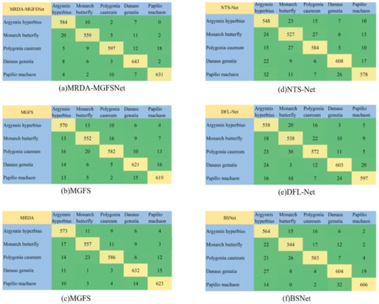 It can be seen from the confusion matrix that the MRDA-MGFSNet proposed in this paper had a better butterfly classification effect. Compared with NTS-Net, DFL-Net and BSNet, the FP value (FN value in the same column) of the MRDA network for the Monarch butterfly and Polygonia caureum with a large proportion of complex and similar backgrounds in their images was significantly reduced. This is because the MRDA algorithm is more inclined to retain and pay attention to the butterfly characteristics and discard useless background information. The decrease in FP value increases the recall rate of these two categories of butterflies. According to Equation (7), with the same accuracy, the increase in recall rate eventually increases the F1 value. Similarly, compared to the NTS-Net, DFL-Net and BSNet, the MGFS network had an effective inhibitory effect on the FP values of Argynnis hyperbius, Polygonia caureum, and Papilio machaon, which have spots as important information and have fewer patterns. This is because the MGFS algorithm has a more scale-feature-sharing mechanism that can retain more subtle features such as butterfly patterns and spots. In the end, the suppression of the FP value can achieve the effect of increasing the F1 value. The network that combines MRDA and MGFS is more powerful in terms of overall performance, and has a good effect on improving the F1 value. In addition, as shown in Table 4, our model achieved an mAP0.5 value of 96.64%, which proves that our model had a good effect in butterfly classification once again. Experiments have proved that under the same experimental environment, our algorithm is more suitable for butterfly classification than some other latest fine-grained classification models.