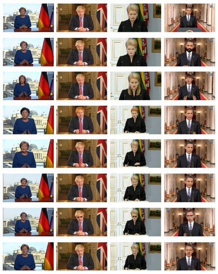 To create the related (i.e., World Politicians Deepfake Dataset (WPDD)) dataset, the videos of twenty world-famous politicians, nine of them women and eleven of them men, were downloaded from YouTube. These videos, the actual lengths between the range of 5 to 16 min, were divided into 946 videos with a length of 10 to 20 s. Then, the frames of these videos were extracted and a total of 320,499 images (frames) were obtained. These images were grouped and various manipulations were applied, including 7 different classes which are makeup (for women only), hairstyle, hair color, age, smile, glasses, beard (for men only), and face swap. For each manipulation class, different types of manipulations were applied to belong to the related class. For instance, the different hairstyle types such as curly, straight and wavy were used for the hairstyle manipulation class. Figure 2 shows a sample of the dataset.