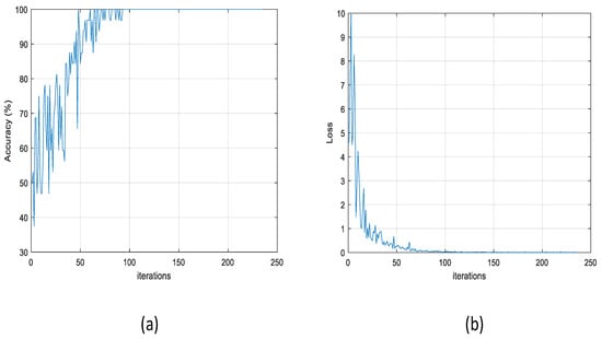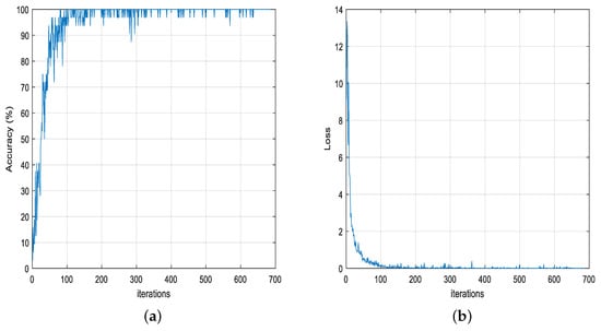 Figure 5 shows the training and the loss progress of the multi-stream CNN model for Scenario 2. While Figure 5a shows the training accuracy curve, i.e., the loss curve through the training. As seen in Figure 5a, the multi-stream CNN for the first scenario was trained for 700 iterations, where the elapsed time was 81 min. The initial performance of the CNN model was around 10% and it increased toward 90% through the 100th iteration. In addition, after the 100th iteration, the training accuracy was approximately 100%. The loss value was around 13 at the beginning of the training and it dropped to around zero at the 100th iteration. The loss value was quite close to zero after the 100th iteration.
