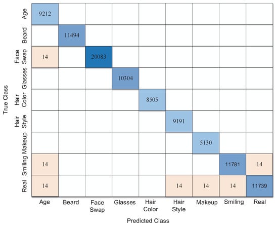Figure 6 shows the obtained confusion matrix for Scenario 2. The columns of the confusion matrix show the predicted classes, while the rows show the true classes. From Figure 6, 9212, 11,494, 20,083, 10,304, 8505, 9191, 5130, 11,781, and 11,739 faces from Age, Beard, Face swap, Glasses, Hair color, Hairstyle, Makeup, Smiling, and Real classes were correctly classified by the proposed multi-stream CNN approach. As seen in Figure 6, 14 samples from Face swap, Smiling, and Real classes were predicted as Age class. In addition, 63, 7, 7, and 49 samples from Hair Color, Hairstyle, Smiling, and Real were misclassified.