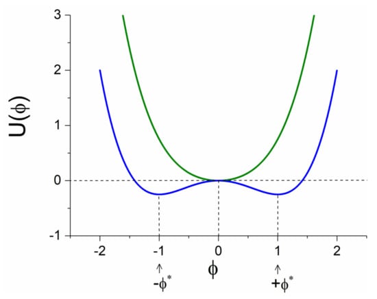 The symmetric phase, in the framework of theory, is described by the relationship: , (, illustrated in Figure 1 as the green curve. In this phase, the system exists in the ground state ( The spontaneous symmetry breaking (SSB) [1], achieved for (), is presented with the blue curve in Figure 1, where the two stable points are the new ground states at the positions . The free energy in SSB is: