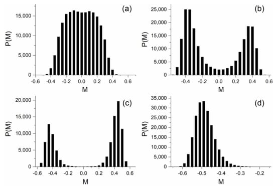 It is known [1] that this model undergoes a second-order phase transition when the temperature falls below a critical (pseudo-critical) value. Thus, for a lattice, the critical temperature has been found to be () [13]. Therefore, in temperatures lower than this value, an SSB phenomenon appears. The quantity we record in the numerical experiment performed with the metropolis algorithm is the mean magnetization that plays the role of the order parameter. The trajectory generated by the numerical experiment is a “time series” of the fluctuations of the order parameter. The G-L free energy has the form of Equation (2), with . A time series with length can be recorded with a time-step, the algorithmic time of simulation, which is a lattice sweep. In Figure 2, we present the distribution of the magnetization “time series” for four different temperatures. The simulation was performed for sweeps. In the limit, where , the lobes in Figure 2b,c become absolutely symmetrical to each other.