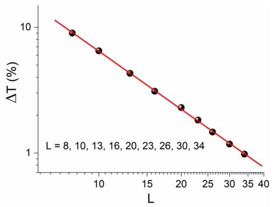 As seen in Figure 2, after the temperature drops under its critical value , the new phase of broken symmetry appears, where the “trajectories” of order parameter are attracted by the new ground states. However, for a small temperature interval, the trajectories are not completely separated, but there are trajectories around the critical point. Within this narrow zone of temperatures, the “communication” between the two degenerated vacua is possible due to the existence of the unstable critical point that repels the trajectory from one vacuum to the other. Therefore, the unstable critical point does not vanish immediately after the change of sign of the parameter in the G-L free energy of Equation (2), but continues to exist in the phase of broken symmetry. Thus, there is a hysteresis in its disappearance, the width of which depends on the length of the lattice, as shown in Figure 3. We define this hysteresis zone (in the form of percentage) as: