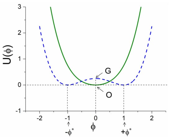 In nature, the system can exist in only one of these ground states. Thus, the symmetry appears to be broken. An extension to the three dimensions produces the “Mexican hat potential” [2]. When the transition from ( to () occurs in the G-L free energy parameters, the green curve is converted to the blue one (see Figure 1). The ground state ( in the symmetric phase is the critical stable fixed point for . When this transition takes place, the position of the critical point does not change, but its character, namely its stability, changes. The stable critical point is converted to an unstable critical point. This change is the most important in critical phenomena because it cancels the existence of a stable critical point at position and creates two new degenerated stable fixed points at positions . This is necessary for the system to choose one of the two positions and thus the SSB phenomenon is completed.