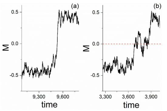 In Figure 6a, a kink-type SSB soliton for a segment of the magnetization time series, just on the SSB (at ), is shown. Figure 6b presents a corresponding segment of the magnetization time series for the temperature within the hysteresis zone. The kink–soliton is presented as the transition between the two states (for
