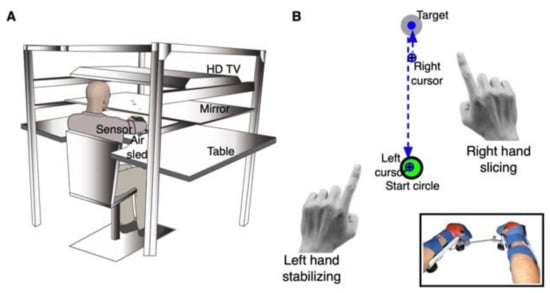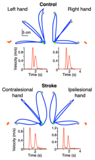 Bilateral upper limb tasks must integrate the action of two effectors that are asymmetrical in terms of motor performance, a phenomenon that appears to emerge from the specialized contribution of each hemisphere to the contralateral arm [,]. Specifically, it has been shown that left and right hemisphere damage produces different motor deficits in both arms of premorbidly right-handed stroke survivors []. While left hemisphere damage tends to produce deficits in trajectory features, such as movement smoothness, linearity, direction specification, and initial acceleration features [,], right hemisphere damage produces deficits in movement deceleration [,] and in the ability to achieve an accurate and stable final position []. These studies, as well as studies in neurologically intact typical adults, have led to the hypothesis that the left hemisphere in right-handers is specialized for control of movement trajectory and intersegmental coordination, while the right hemisphere is specialized for the control of limb steady-state positions and control of limb impedance []. A large number of previous studies in typical adults and in unilateral stroke survivors have provided support for this model through the study of unilateral reaching movements [,].