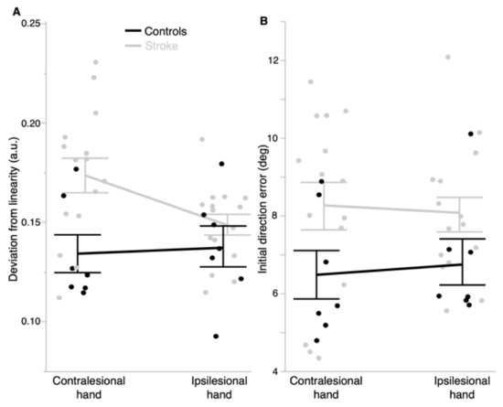 Control of reaching performance is more impaired in stroke survivors compared to controls. (A) Stroke survivors produced significantly less linear reaching movements compared to controls (p < 0.05), and their contralesional hand performance was worse than that of the ipsilesional hand. (B) Stroke survivors also produced significantly larger initial direction errors compared to controls (p < 0.05). Error bars represent 1 SEM. Each marker within a hand group represents a participant.