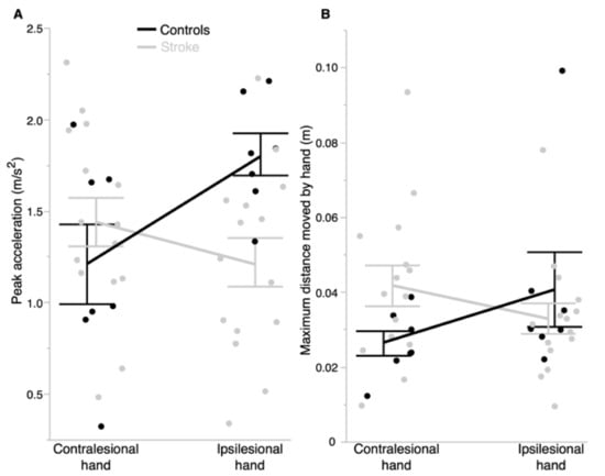 We examined differences between the two groups in the ability to maintain a steady position with the stabilizing hand while the other hand was performing the slicing movement. Figure 4 shows the average peak acceleration and maximum distance moved by the stabilizing hand for each group’s ipsilesional and contralesional hands. Our mixed model ANOVA for peak acceleration identified a statistically significant group × hand interaction (F (1,20) = 6.75, p = 0.017), such that the dominant right hand of controls accelerated more than the nondominant left hand (mean difference: 0.60 m/s2; p = 0.13). In contrast, peak acceleration of the ipsilesional and contralesional hands of stroke survivors was not different from one another (mean difference: 0.22 m/s2; p = 0.61). There were no main effects of group (F (1,20) = 1.19, p = 0.29) or hand (F (1,20) = 1.45, p = 0.24). While the spring forces imposed by motion of the reaching hand produced such interaction effects with regards to peak acceleration, these effects were not significant for the maximum distance moved by the hand (F (1,20) = 4.04, p = 0.058). There were also no main effects of group (F (1,20) = 0.31, p = 0.59) or hand (F (1,20) = 0.36, p = 0.55). Thus, our results suggest that control of postural features in such a task may produce similar behaviors between hands of stroke survivors.