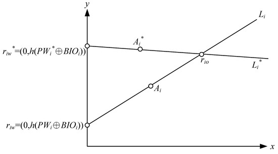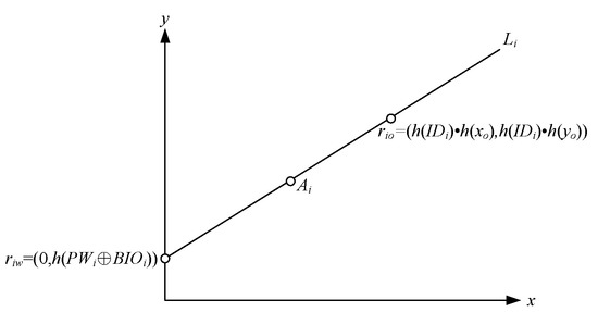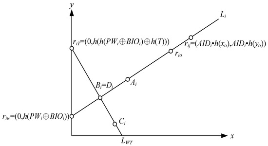 Step 3: The mobile phone calculates the point between riw and Ai, represented by Bi, generates a new point riT, which is equal to (0, h(h(PWi⊕BIOi)⊕h(T))), and then uses riT and Bi to generate a new line LWT.