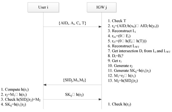 After the IGW receives the login request message, the IGW starts the authentication process to verify the user’s request message, as shown in Figure 4 and Figure 5. The steps of the certification process are described below.