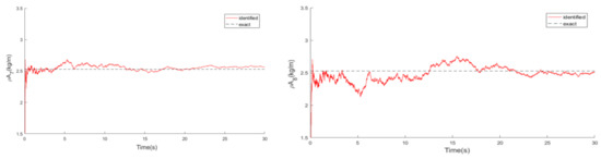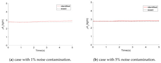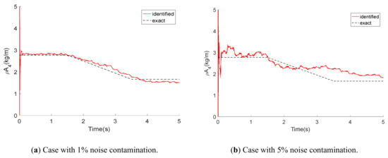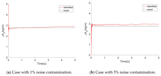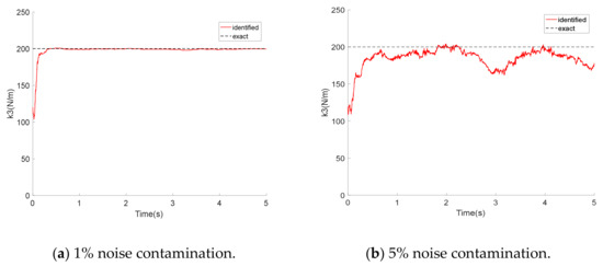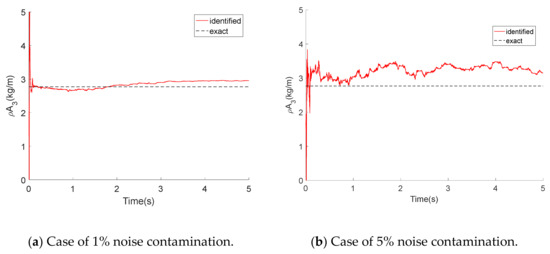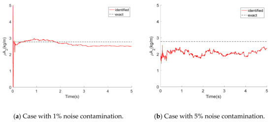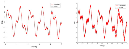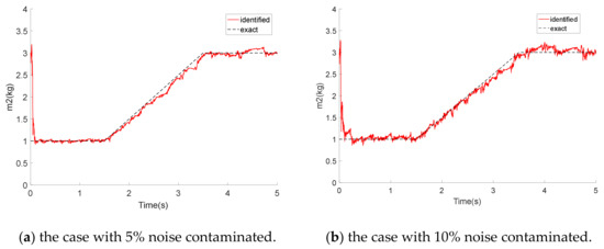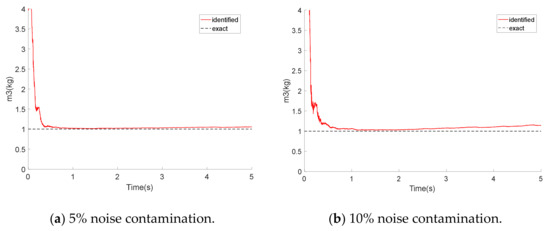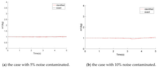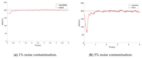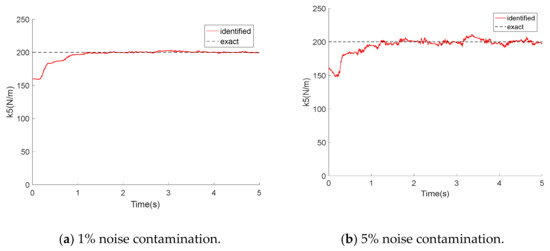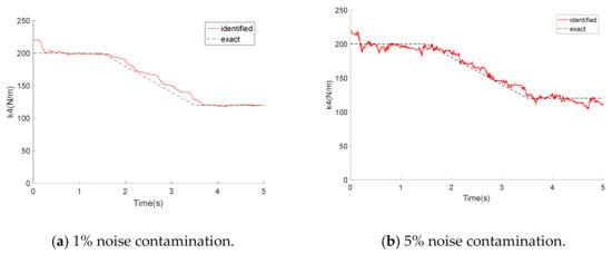 A load of is applied on the mass block m1 and 5%, 10% noise are applied to the measurement vector, respectively. The identification results are shown in the Figure 2, Figure 3, Figure 4 and Figure 5. The left plots are for the case with 5% noise, while the right side is for the case with 10% noise.