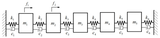 In the second numerical test, we study a five-degrees-of-freedom system. We show in Figure 6 a schematic diagram of the structure. In this test, we consider a gradually varying stiffness. The damping of the system is assumed to be Rayleigh damping of the coefficients = 0.05, = 0.02.