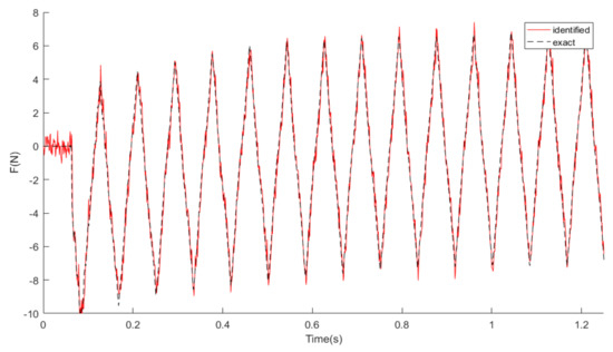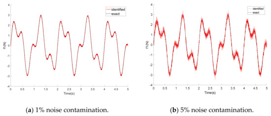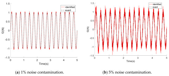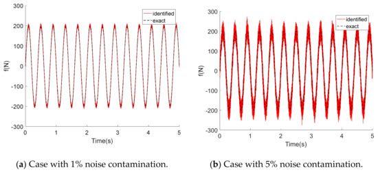 In order to illustrate the identification accuracy of the unknown loads, the relative error (RE) and the correlation coefficient (r) methods are used to verify the results. The relative error refers to the ratio of the absolute error between the identification result and the exact value divided by the exact value. The smaller the relative error is, the higher the accuracy of the identification result. The correlation coefficient (r) is the quantity to study the level of the linear correlation between the variables and is expressed as a percentage. The closer the correlation coefficient is to 1, the better the identification. The errors are shown in Table 2. It can be seen that the algorithm can accurately identify the unknown load in general even when the measured data is contaminated with 5% or 10% noise.