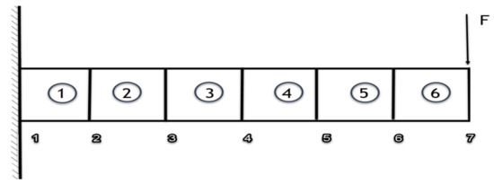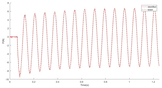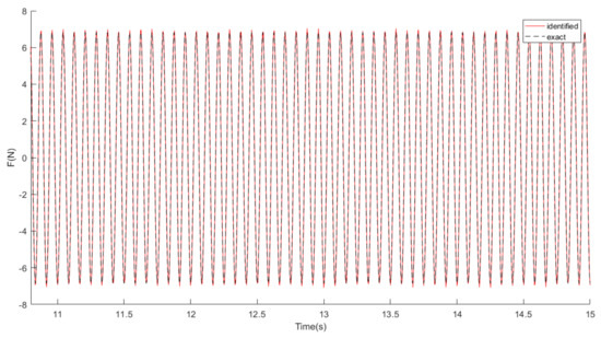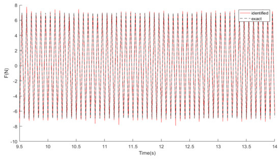 The results’ accuracy clearly shows that the reduction algorithm works well with the proposed load identification algorithm. The load as well as the unknown mass of each beam element are recovered with good accuracy. The errors of the identification results are shown in Table 5 and Table 6 for the mass and the load, respectively. The results with both levels of noise are accurate with engineering accuracy, i.e., the error is the same level as that of the pollution noise. Obviously, increasing the noise level results in larger errors, but the algorithm remains to provide meaningful results.
