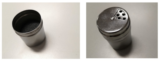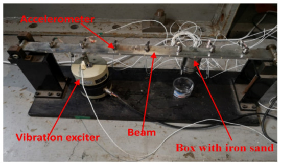 To vary the beam mass, we fix an aluminum box at 0.48 m from the left of the simply supported beam. The aluminum box is filled with steel sand. To change the beam mass, the box has holes at the bottom so that it leaks the steel sand as the experiment progresses. The aluminum box with the iron sand and the holes is shown in Figure 20, while a schematic diagram of the experiment is shown in Figure 21. The experimental setting is shown in Figure 22. All the used instruments are listed in Table 9. The sampling rate is set to 8196 Hz, and the excitation signal on the exciter is measured by a force sensor. The beam is meshed into eight beam elements. The aluminum box is fixed to element 6. The acceleration responses are measured by sensors placed at the nodes as shown in Figure 21. Two loading cases are considered. First, a sinusoidal load is applied, and then the experiment is repeated for a triangular wave load.