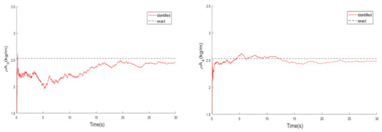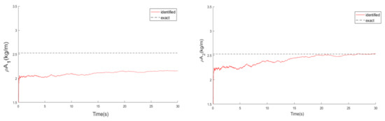 The partial derivatives of the state updating equation and the measurement updating equation with respect to the load vector are the same as the Equations (35) and (36). However, they are not constant matrices in this case because the mass coefficient will change in the filtering process. The mass coefficient must be replaced back to the mass matrix in each filtering. The algorithm procedure is then the same as that of the unknown parameter stiffness or damping coefficient, but the difference is in calculating the Jacobian matrix.