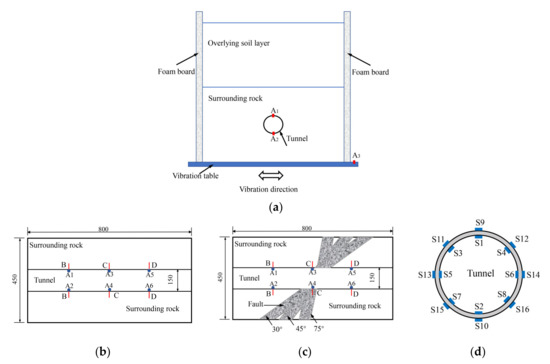 The sensor layout is shown in Figure 2. The layout scheme of the acceleration of the transverse section of the tunnel is shown in Figure 2a. Figure 2a shows the layout plan of the transverse section acceleration of the tunnel. The layout plan of the cross-section of the four test conditions was the same. A0 was the measuring point on the shaking table, and A1–A6 were the monitoring points on different sections, which were arranged on the vault and the inverted arch. Figure 2b,c show the longitudinal section acceleration and strain sensor arrangement schemes of ordinary tunnels and fault-crossing tunnels. Three cross-sections—B–B, C–C and D–D—were monitored at the fault and 200 mm from the left and right of the fault (Figure 2) to examine the seismic response of the lining in the axial direction. Figure 2d shows the layout of the strain gauges on the three monitoring surfaces. A symmetrical layout of the inside and outside was used.