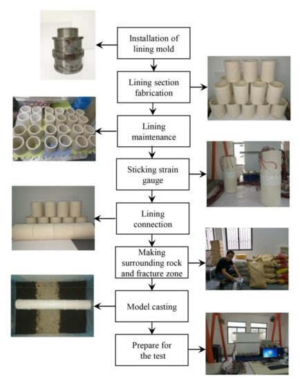 To better simulate the Xianglushan Tunnel, the tunnel lining, surrounding rock, and broken zone materials were prefabricated in sections and poured in layers. (1) For the lining production, the steel mold was prefabricated in sections and cured for 7 days at room temperature. The sensor was installed at the marked position, and then the section lining was bonded and formed with solid glue. (2) The surrounding rock material was mixed on site, and the elevation position of the layered pouring was marked in the model box in advance; the layered layer was used for compaction. The thickness of each compaction was 100 mm to ensure compact compaction [29]. (3) The crushing belt material was also mixed on site, and two partitions were made, which were placed in parallel according to the calculated position. This could prevent the surrounding rock material from slipping to the broken zone area; the broken zone material was poured by layered pouring and layered compaction. (4) According to the geological conditions of the site, the upper covering layer of the prototype tunnel was simulated with a grade V surrounding rock material with a thickness of 20 cm. After all of the pouring was completed, it was cured at room temperature for two days, and then the vibration test was carried out. The concrete construction drawing of the model is shown in Figure 3.