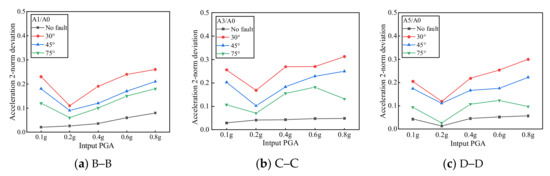 Figure 5 shows the 2-norm curve diagram under different input PGAs under various working conditions. Figure 5a–c are the 2–norm deviation diagrams of section B–B, section C–C, and section D–D, respectively. The deviation index of 2–norm reflects the difference between the two signals. If the value of μ is zero, the two signals are exactly the same. Under different sections, the value was the largest when the fault dip was 30°, followed by 45°. The ordinary tunnel was the smallest, which meant that a smaller fault dip corresponded to a greater deviation in the acceleration response signal from the reference signal. The value of each section was less than 0.315, indicating that the test results would not be affected by boundary effects.