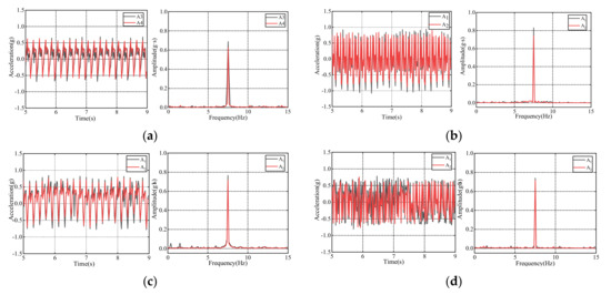 where is the 2–norm deviation index, and and are the acceleration peaks of the acceleration sensor on the lining and the acceleration sensor on the vibrating table, respectively, as the target signal and the reference signal. In this model experiment, corresponds to A1, A3, and A5, and corresponds to A0.