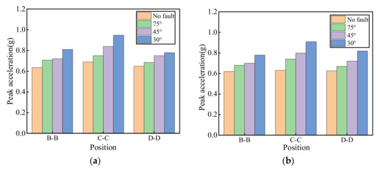 Acceleration peaks on each section under different fault dips. (a) Crown; (b) invert.